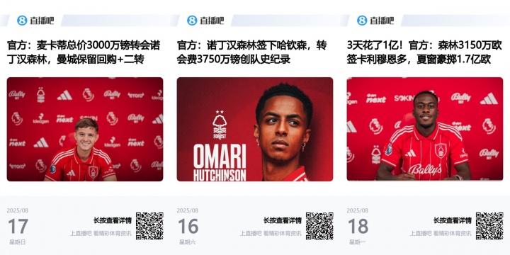 此前诺丁汉森林在8月16日已经官宣签下哈钦森和麦卡蒂,加上卡利穆恩多,森林在3天内花费了超过1亿欧元。今年夏窗,诺丁汉森林在转会市场上已经投入超过1.7亿欧元。